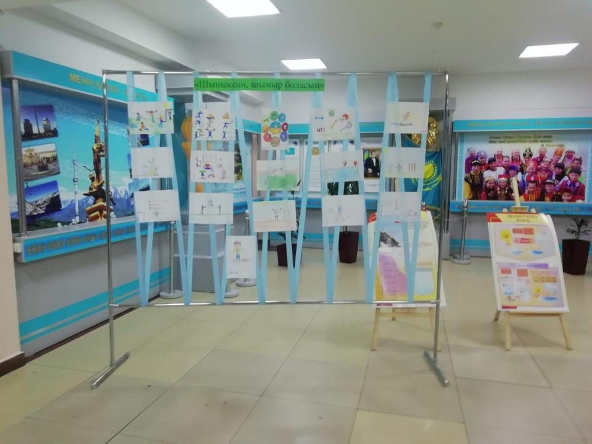 Байқауға қатысушылардың жұмыстарынан арнайы көрме жасалып мектеп-лицейдің бас кіре берісіне орналастырылды.