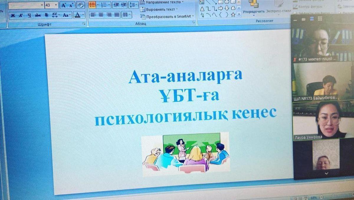 №173 мектеп-лицейде өткен «Директорлық сенбі – ата-ана үні» онлайн-кездесу 24.04.2021ж. күні өтті. Күн тәртібінде: 11 -сыныптың қорытынды аттестаттауы туралы(Мектеп директоры Л.М.Байымбетова)«Ата-аналарға ҰБТ алдындағы психологиялық кеңес»
