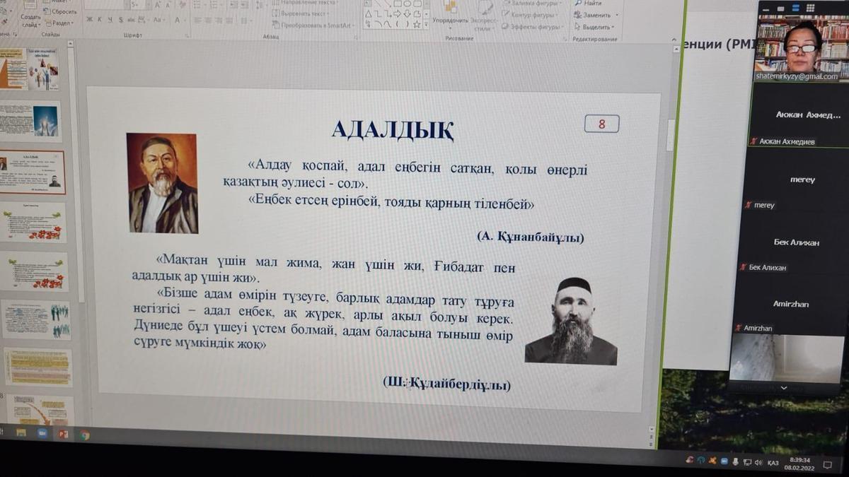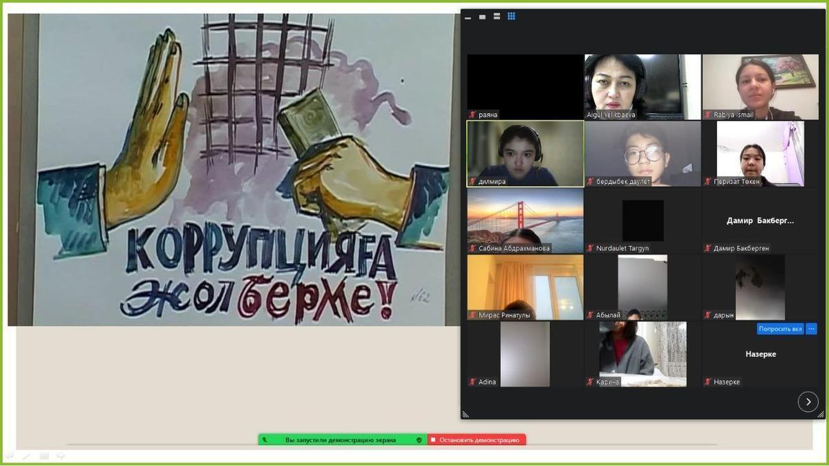Сынып сағаты барысында оқушыларға сыбайлас жемқорлықтың қоғам үшін ең өзекті мәселелердің бірі болып табылатынын және оның кеселі біздің мемлекетімізге әлеуметтік дамуымызды тежейтінін айтты. Сондай-ақ, жас ұрпақ үшін сыбайлас жемқорлық болашағына балта шабатын қауіп екенін айтып өтті.
