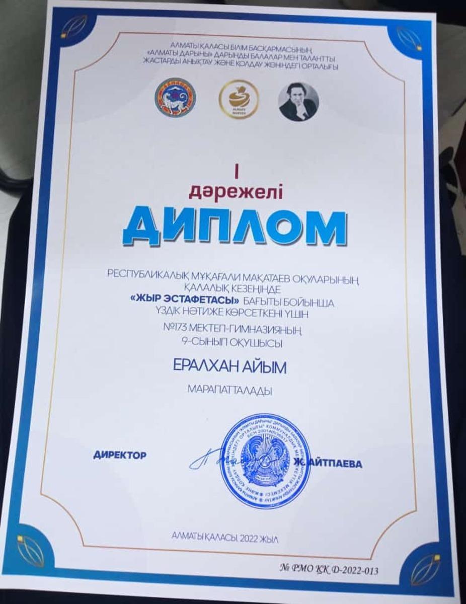 Республикалық Мұқағали Мақатаев оқуларынан 9 сәуір күні өткен қалалық кезеңінде "Жыр эстафетасы" бағыты бойынша үздік нәтиже көрсеткені үшін мектебіміздің 9 "Г" сынып оқушысы Ералхан Айым жүлделі 1 орынды иеленіп, әрі қарай дарабоз ақынның туған жері Қарасаз өлкесінде өтетін республикалық кезеңінде бақ сынайтын болады.
