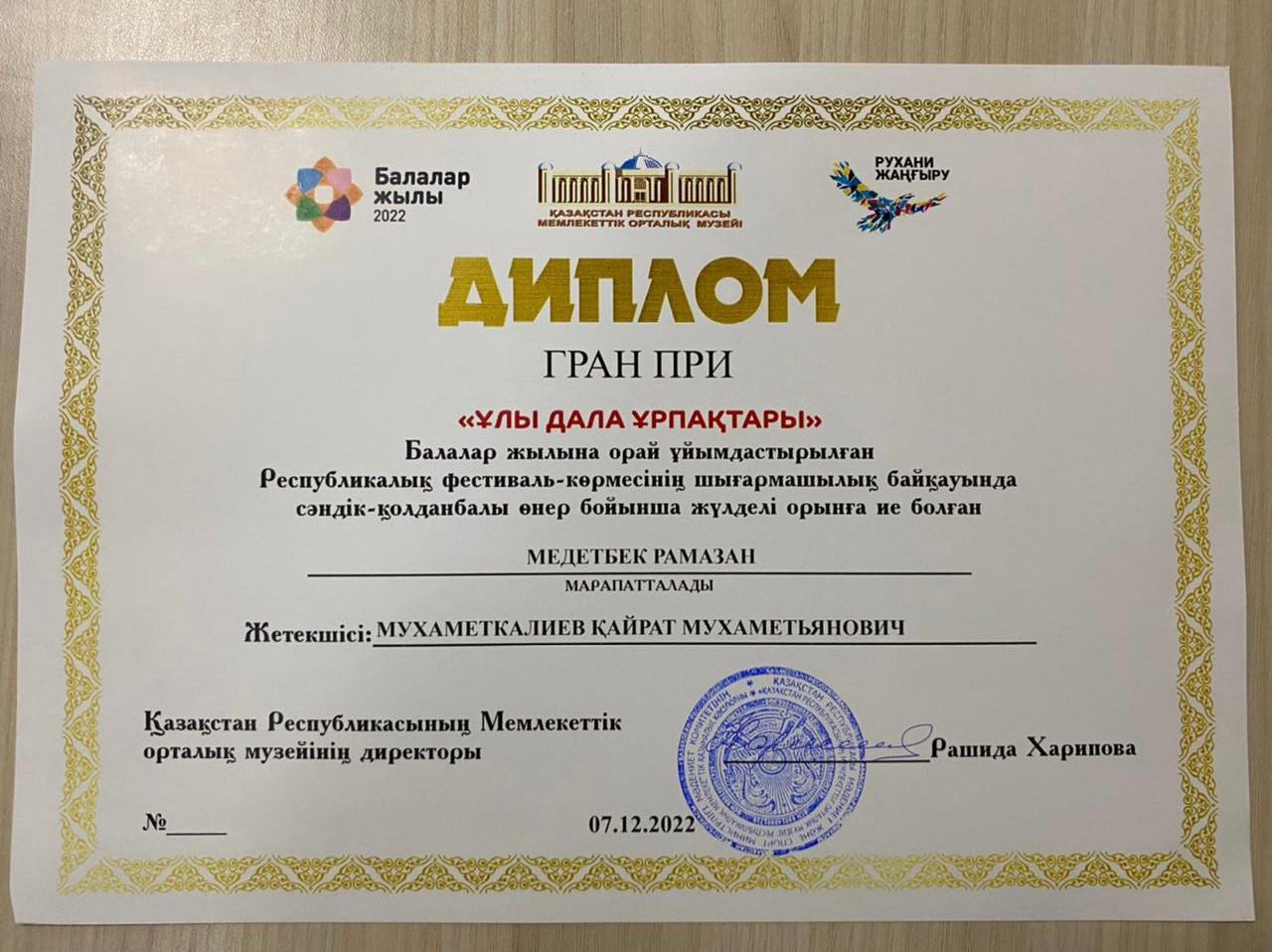 Сәндік- қолданбалы өнер: Инженерлік нысан номинациясы бойынша 8 б сыныбы оқушысы Медетбек Рамазан бас жүлдені иеленді. Жетекшісі Мухаметқалиев Қайрат