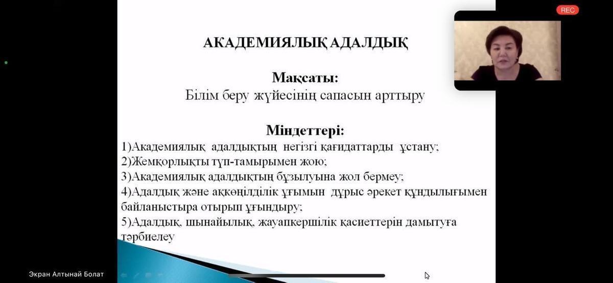 Жалпы жиналыс барысында мектеп басшысы академиялық адалдықтың негізгі қағидаттарын ұстану, сондай-ақ, бұзылуына жол бермеу, жемқорлықтың алдын-алу және оқушыларға адалдық, шынайылық, жауапкершілік қасиеттерін дамытуға тәрбиелеу жөнінде айтылды.