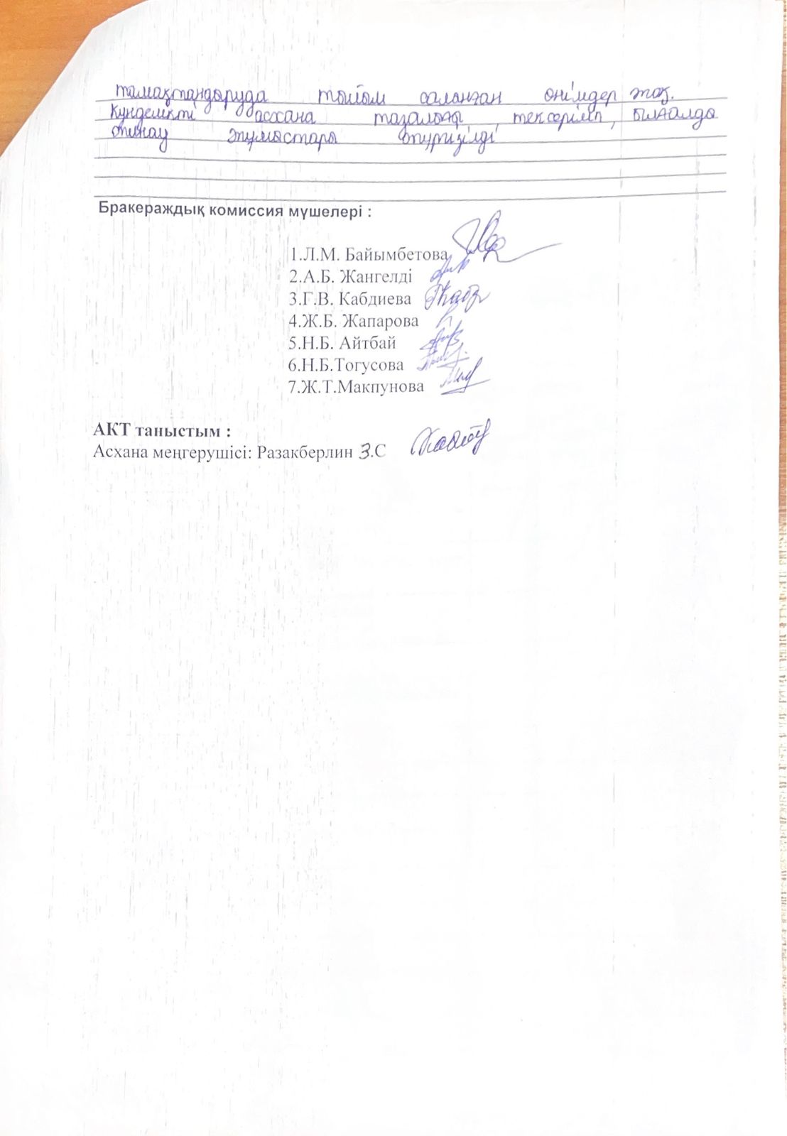 Бракераждық комиссияның қыркүйек айына жазған анықтамасы бойынша АКТ