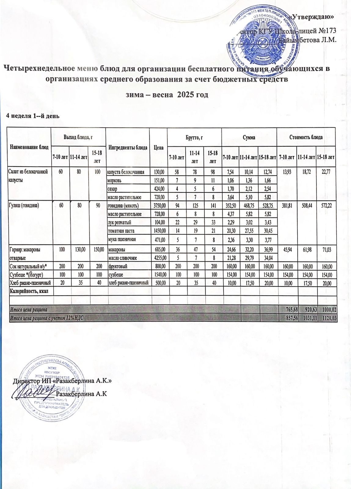 Ыстық тамақ (ас мәзірі бойынша)