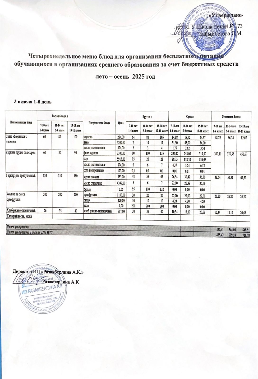 Ыстық тамақ (ас мәзірі бойынша)