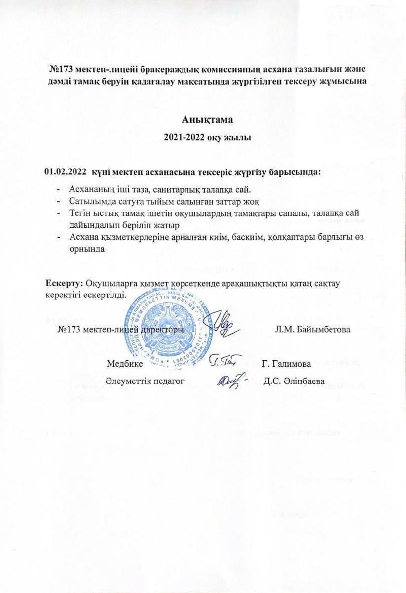 01 февраль 2022 0 1 2 3 4 5 Бракеражды комиссияның асхана тазалығын тексергендігі жөнінде анықтама Осы беттің QR-коды:QR-код этой страницы:
