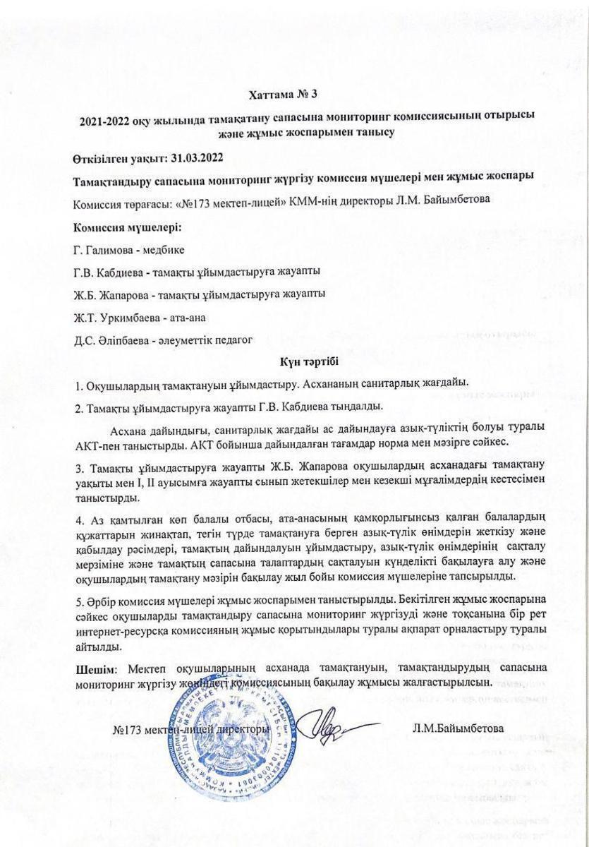 Тамақтандыру сапасына мониторинг жүргізу комиссиясының жұмысын ұйымдастыру туралы